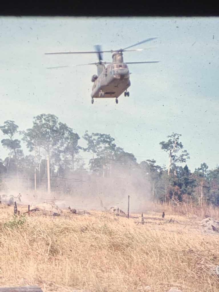 When I landed at Bo Tuc just about 1600 (all the companies were in, and the artillery was just getting settled), there was no CSM there with the CP element. I called Tay Ninh and ordered him to be in Katum in one hour. I got a ride back to Katum with one of the CVH-34, expecting to get him and bring him back with me. He was there at Katum about 1700, but there were no helicopters available to bring us back to Bo Tuc, NONE. Every single one had gone back to Tay Ninh for maintenance, or were down for repair. I couldn't believe it. I was stuck. My heart was sick. I wanted to be at Bo Tuc - needed to be.